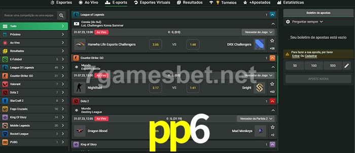 O pp6 oferece uma grande seleção de opções de apostas em e-sports com probabilidades competitivas